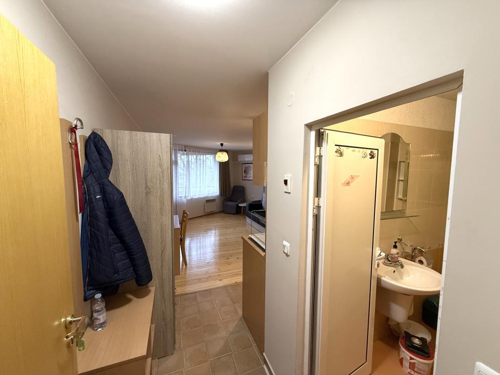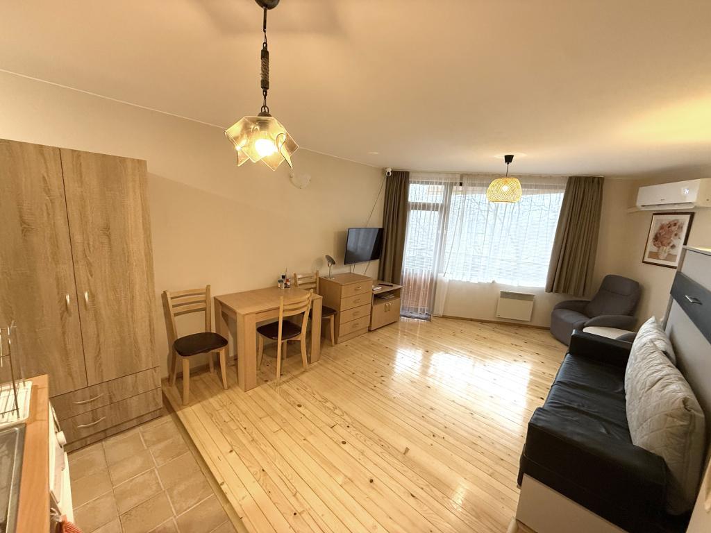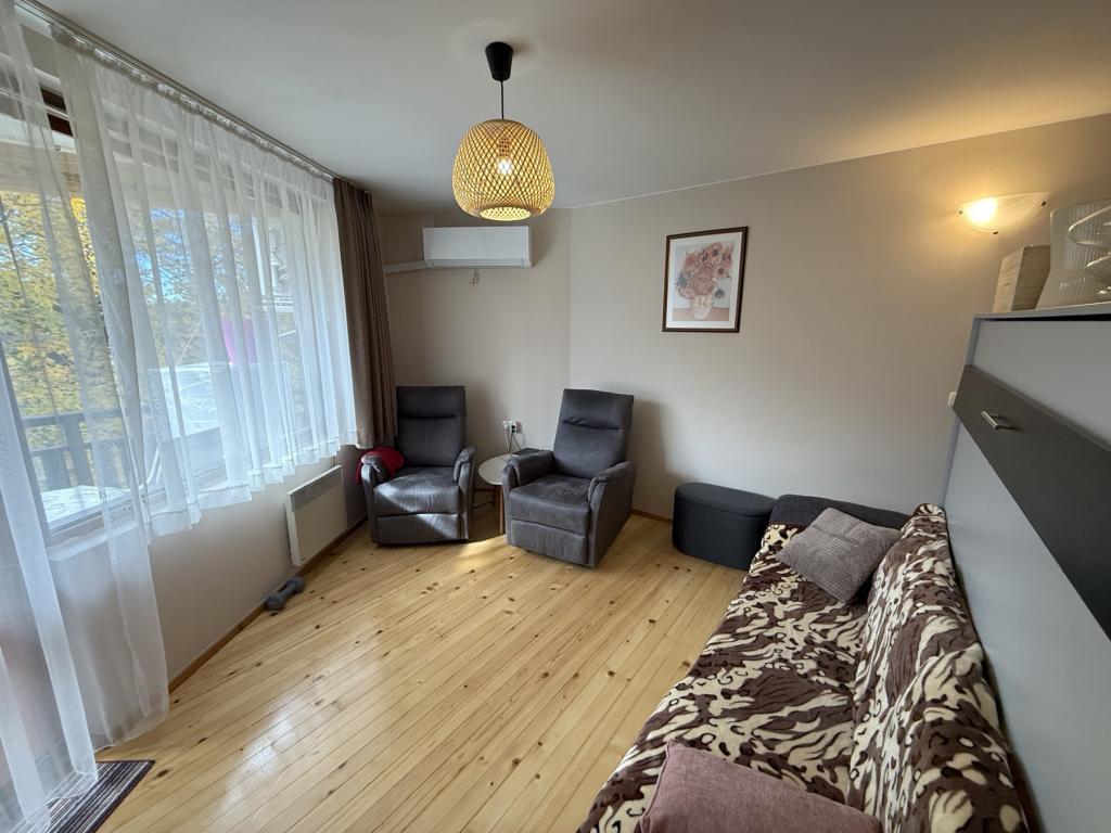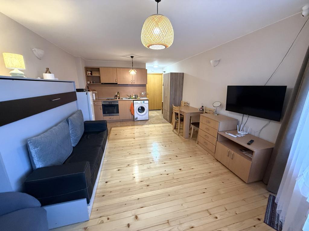 Агенция за недвижими имоти Банско Риалти има удоволствието да Ви предложи напълно обзаведено студио в жилищен комплекс Четирилистна Детелина, разположен в квартал Глазне на 1км от Гондолата. Апартаментът е разположен на четвърти етаж и предлага запдно изложение. Подходящ е за целогодишно или ваканционно ползване. Студиото е след ремонт, свежа боя, лакиран дървен под, нов климатик. Разполага с падащо легло, което в сгънато положение има функцията на диван. Таксата поддръжка е 310 евро на година и включва почистване и поддържане на общите части, асансьор, телевизия, интернет и вода. Чистата площ на апартамента е 36м2.